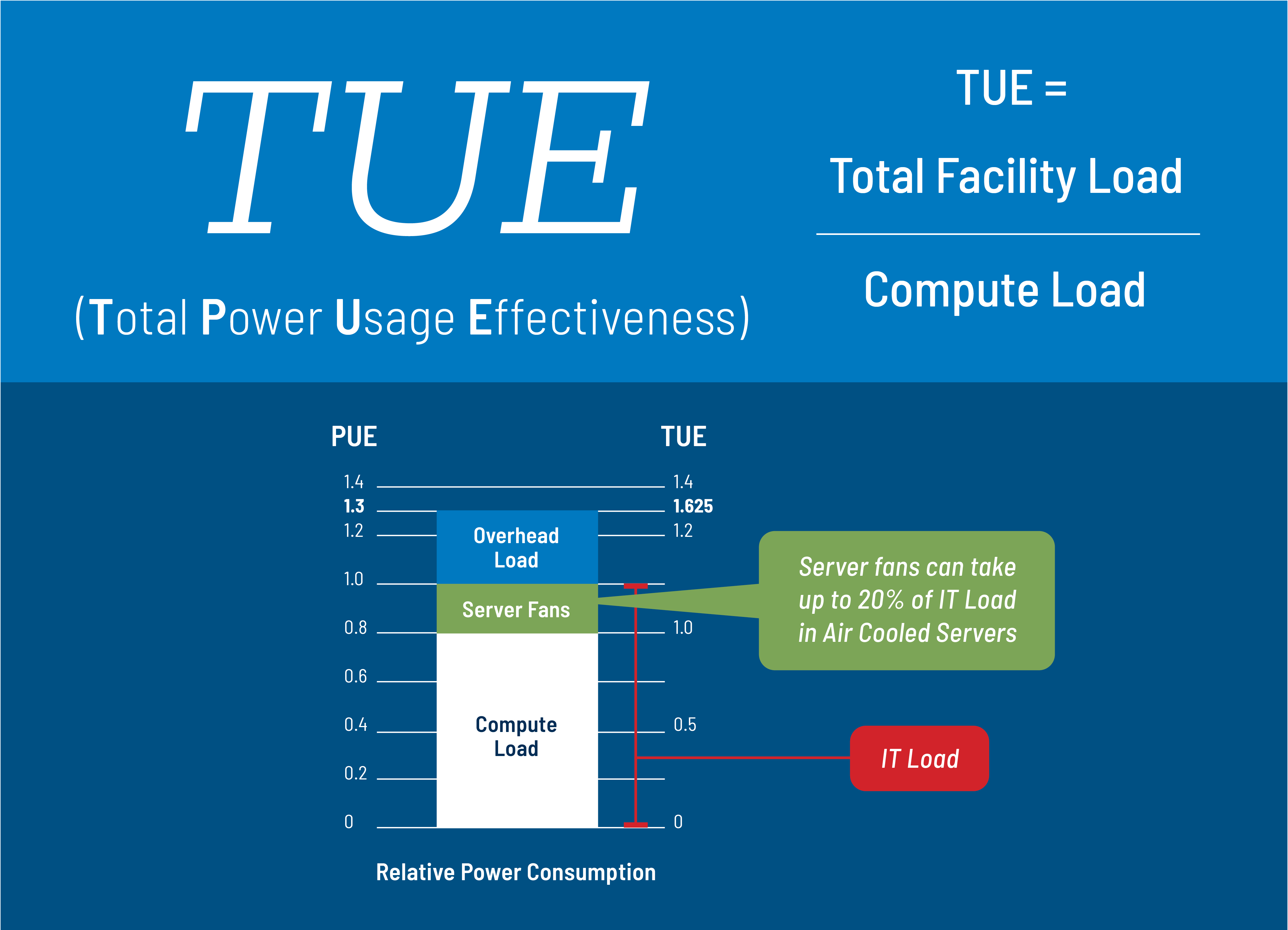 Building on PUE, another metric gaining popularity TUE. TUE expands the traditional PUE concept by including all power consumed inside IT equipment, such as server fans and internal power distribution losses, along with infrastructure overhead. This provides a more holistic view of energy efficiency across the entire data center ecosystem.